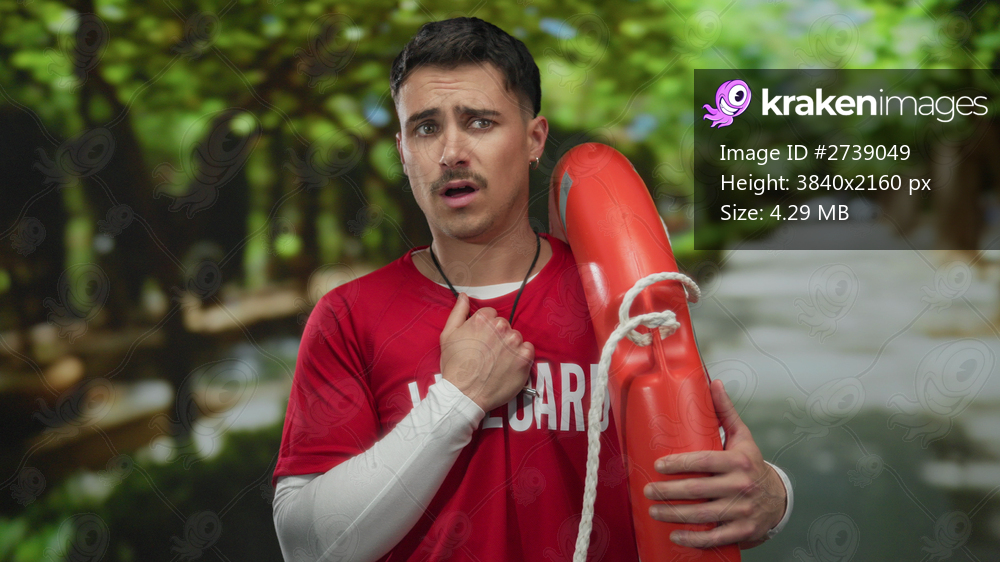 Young hispanic man lifeguard wearing red shirt holding buoy standing outdoors in sunny park looking concerned.