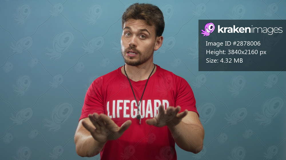 Young hispanic man lifeguard with whistle and hands palms out gesturing stop in blue studio; safety duty caution.
