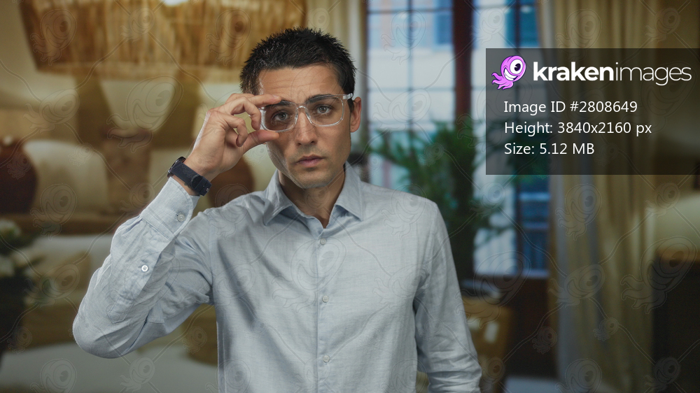 Young hispanic man lifts clear eyeglass frames to his face in a hotel suite with decorative lamps and curtains; concentration.