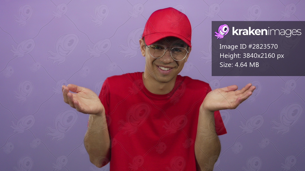 Young hispanic man lifts palms in purple studio wearing red cap, red tshirt and glasses with puzzled look; uncertainty.