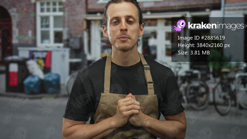 Young hispanic man with long hair and hands crossed over chest wearing a tan apron and black t shirt standing on a street outside a cafe; gratitude humility. - Kraken Images