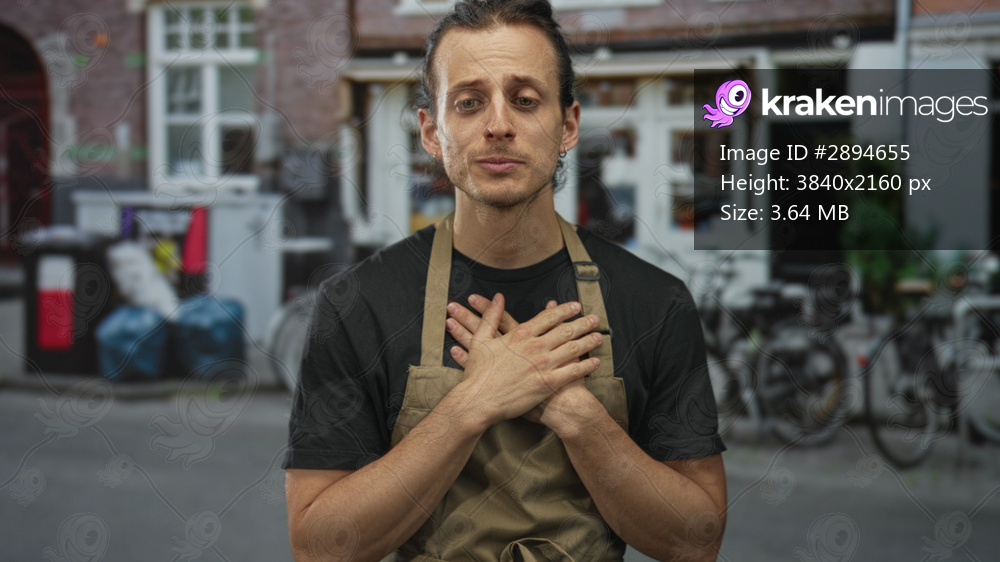 Young hispanic man with long hair and hands crossed over chest wearing a tan apron and black t shirt standing on a street outside a cafe; gratitude humility. - Kraken Images
