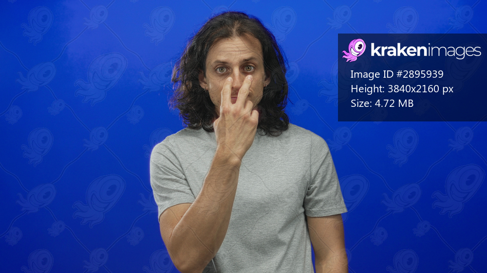 Young hispanic man with long hair holding two fingers near face while seated in studio against vivid blue backdrop; quiet introspection.
