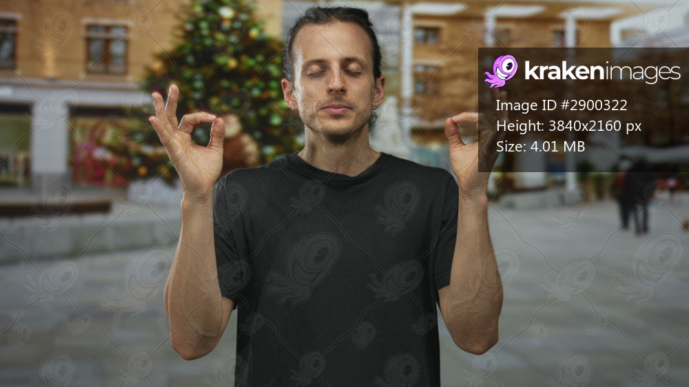 Young hispanic man with long hair makes ok sign with both hands on street in front of a decorated christmas tree and urban plaza; mindfulness calm.