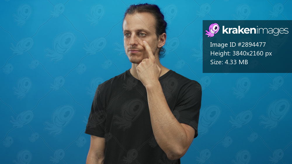 Young hispanic man with long hair points finger to cheek in studio against bright blue backdrop; thoughtful introspection.