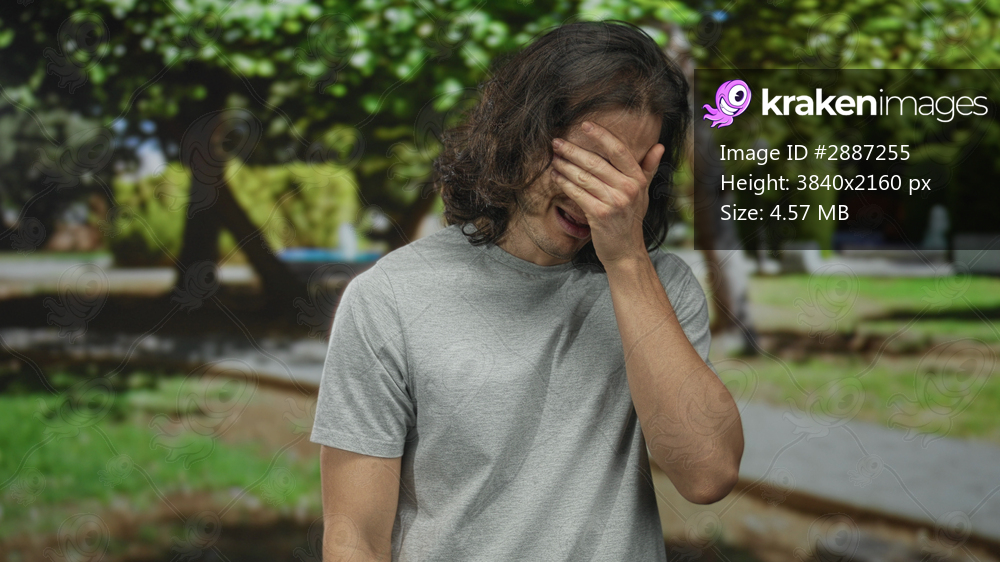 Young hispanic man with long hair removing glasses and hand covering eyes in green park beside tree lined path and lawn; sadness.