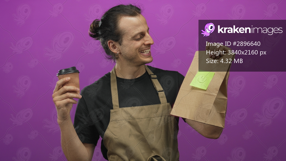 Young hispanic man with long hair wearing an apron holding a coffee cup and paper bag in a purple studio; cheerful takeaway.