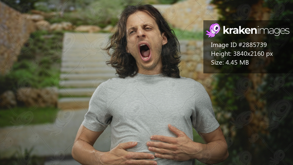 Young hispanic man with long hair winking and puckering lips in front of stone building stairs outdoors wearing gray t shirt; playful mischief.