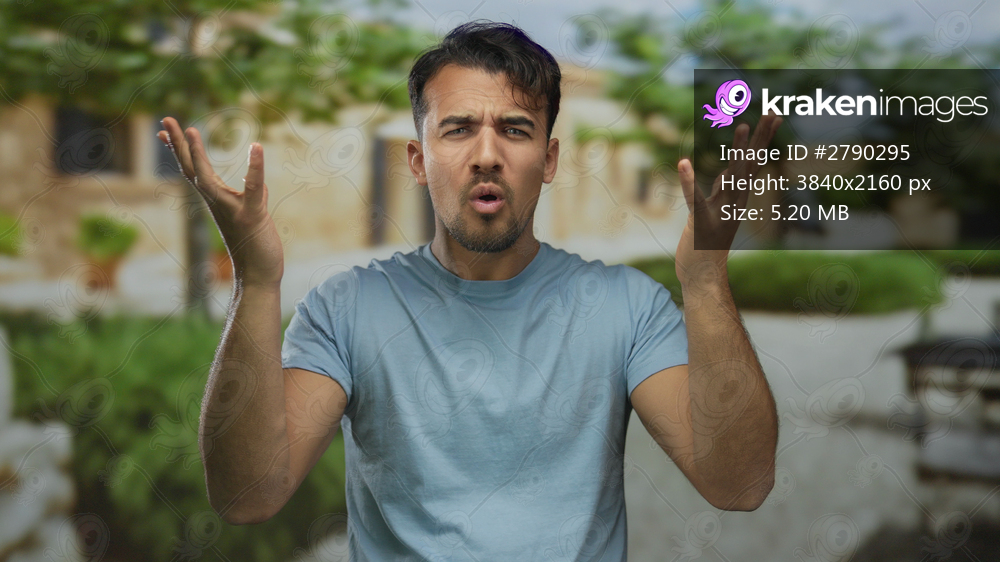 Young hispanic man looking confused outdoors in a casual blue shirt, surrounded by blurred greenery and rustic buildings, expressing puzzlement and gesturing with hands. - Kraken Images