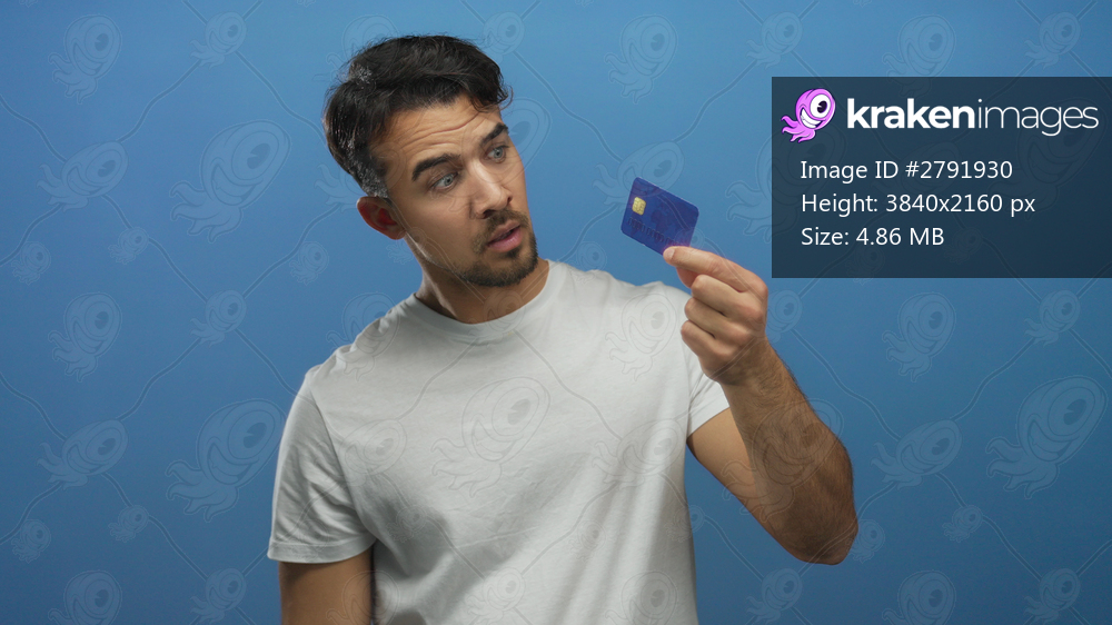 Young hispanic man looking surprised at credit card against blue background suggests confusion or realization.