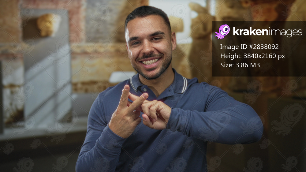 Young hispanic man makes hashtag sign with fingers near classical sculpture in museum gallery hall; joy.