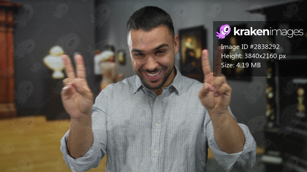 Young hispanic man makes peace sign with hand and smiles before modern paintings in gallery; peace happiness.