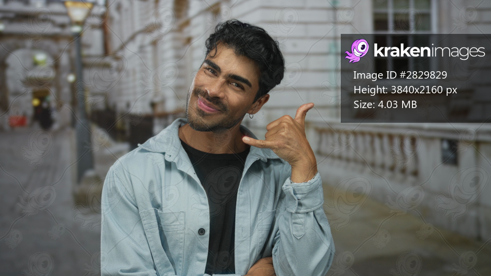 Young hispanic man makes playful call me gesture with hand in a busy city street setting; friendly invitation.