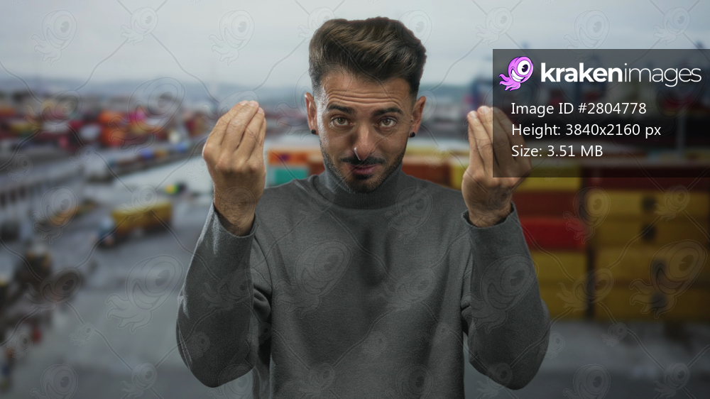 Young hispanic man makes questioning hand gesture at port while standing in front of blurred shipping containers; curiosity.