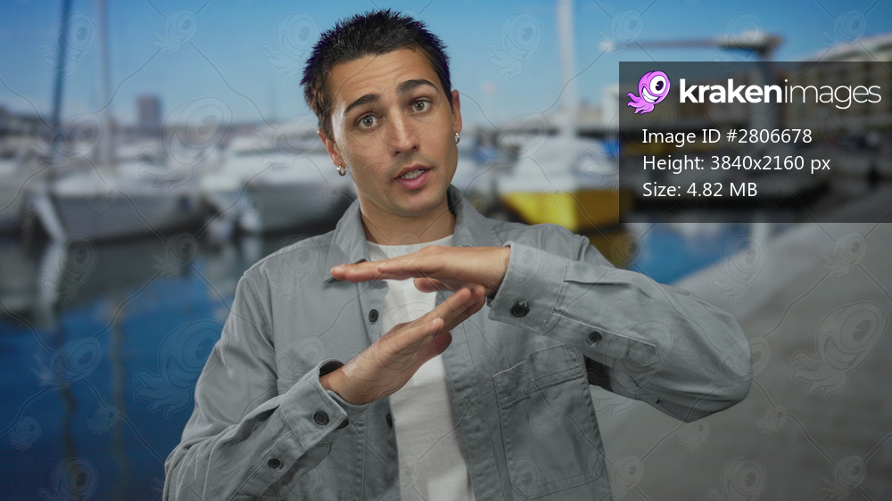 Young hispanic man makes timeout gesture with both hands on street at sunny port harbor; brief pause.