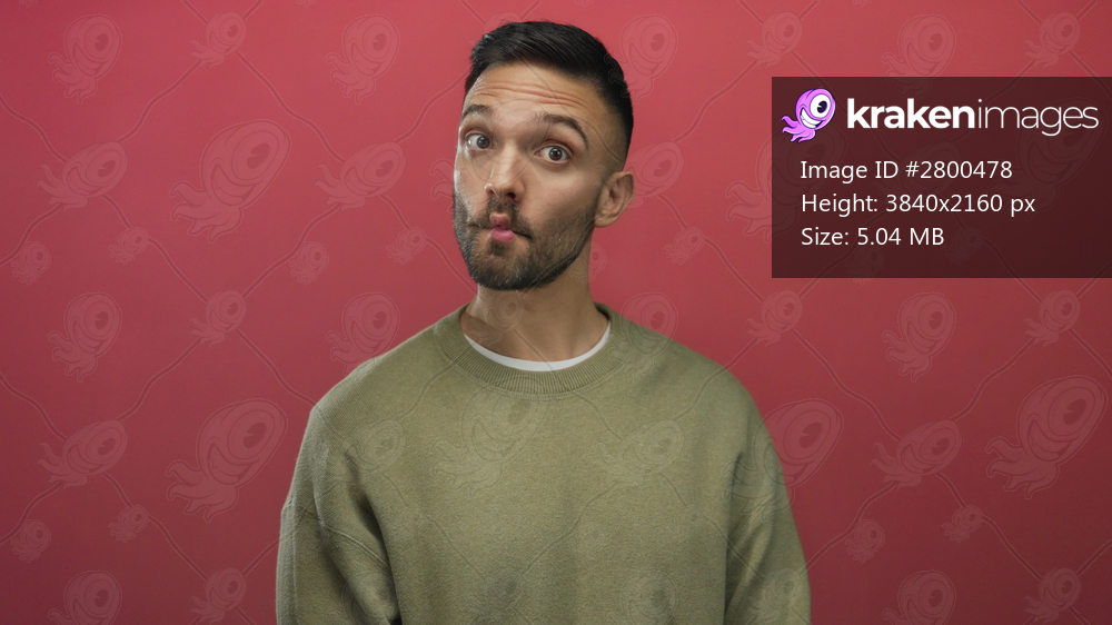 Young hispanic man making a funny face against a vivid red background wearing a casual green sweater, expressing playfulness and humor in a creative portrait setting. - Kraken Images