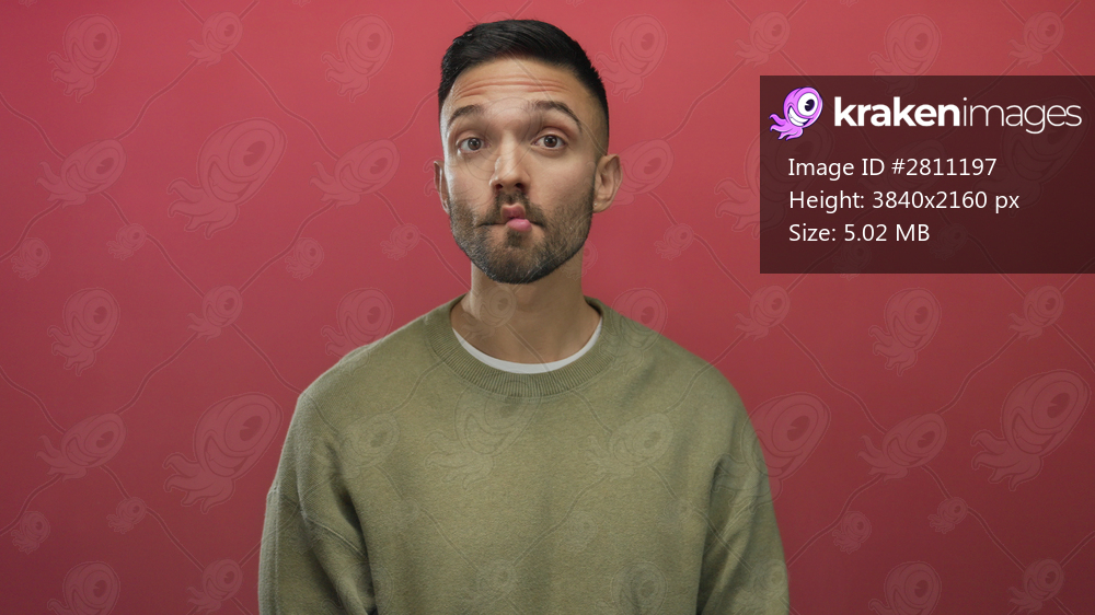 Young hispanic man making a funny face against a vivid red background wearing a casual green sweater, expressing playfulness and humor in a creative portrait setting. - Kraken Images