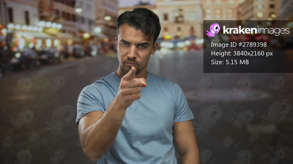 Young hispanic man making a gesture to dismiss someone on a bustling city street with blurred lights at night wearing a blue shirt suggesting a dynamic urban scene outdoors. - Kraken Images
