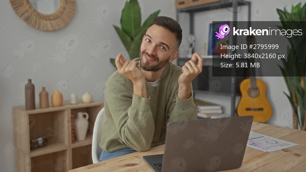 Young hispanic man making a heart gesture with fingers while smiling at a laptop in a cozy living room with modern decor.