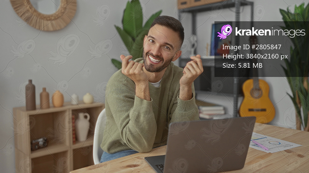 Young hispanic man making a heart gesture with fingers while smiling at a laptop in a cozy living room with modern decor.