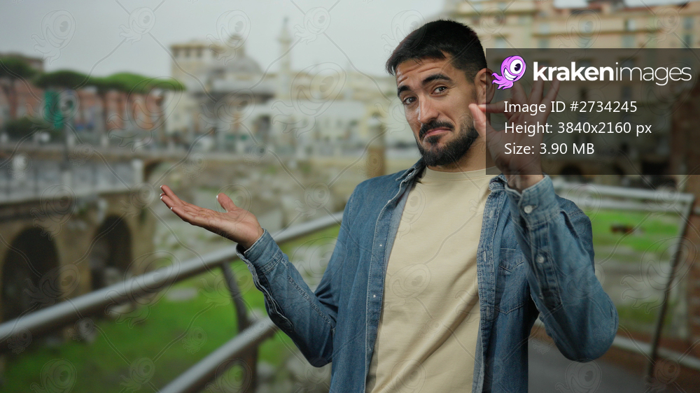 Young hispanic man making an ok gesture and extending hand in ancient roman ruins, italy, blending modern expression with historical backdrop.