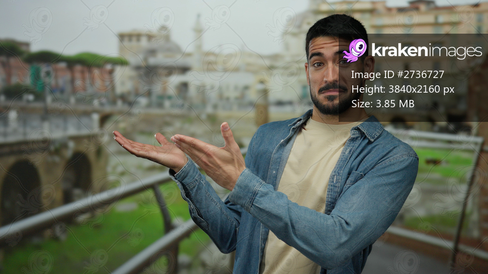 Young hispanic man making an ok gesture and extending hand in ancient roman ruins, italy, blending modern expression with historical backdrop.