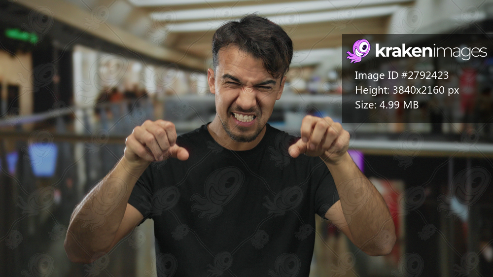 Young hispanic man making claw gesture and playful roar in indoor retail mall environment with blurred background, creating an expressive and joyful ambiance in a shopping center. - Kraken Images