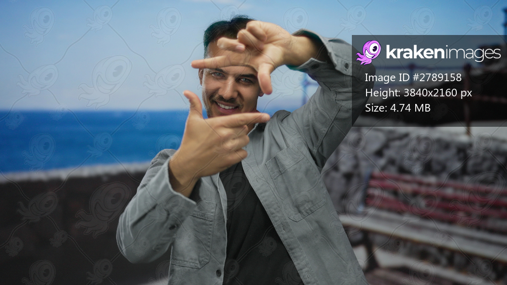 Young hispanic man making framing gesture with hands on seaside promenade with blue sea and clear sky in the background reflecting creativity and outdoor setting. - Kraken Images