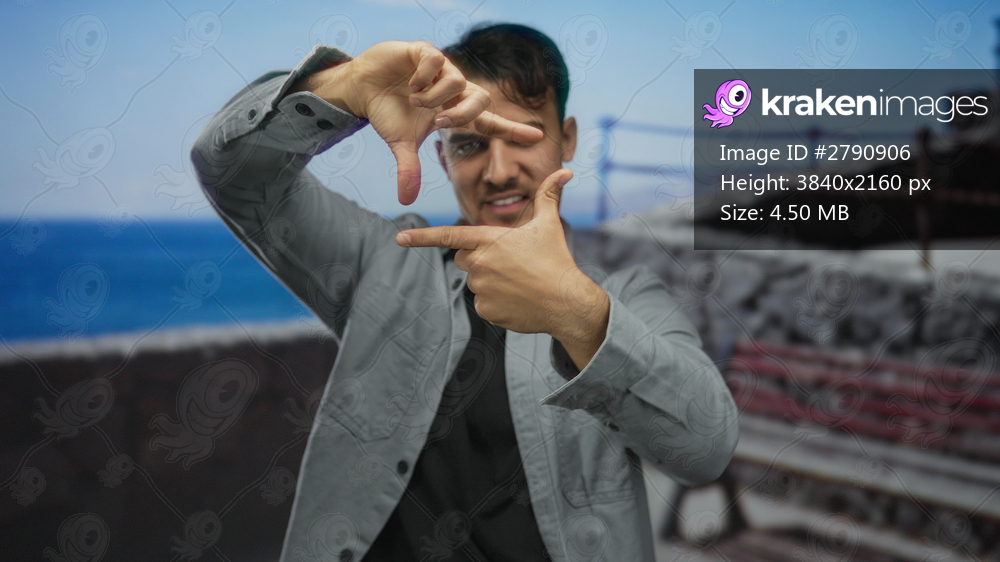 Young hispanic man making framing gesture with hands on seaside promenade with blue sea and clear sky in the background reflecting creativity and outdoor setting. - Kraken Images