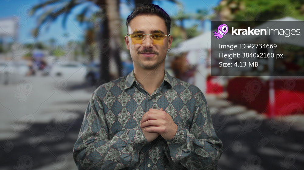 Young hispanic man making heart gesture outdoors on a sunny city street with palm trees and blurred market tents in the background.