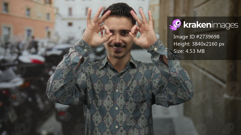 Young hispanic man making ok hand gesture on a city street with a playful expression surrounded by urban scenery.
