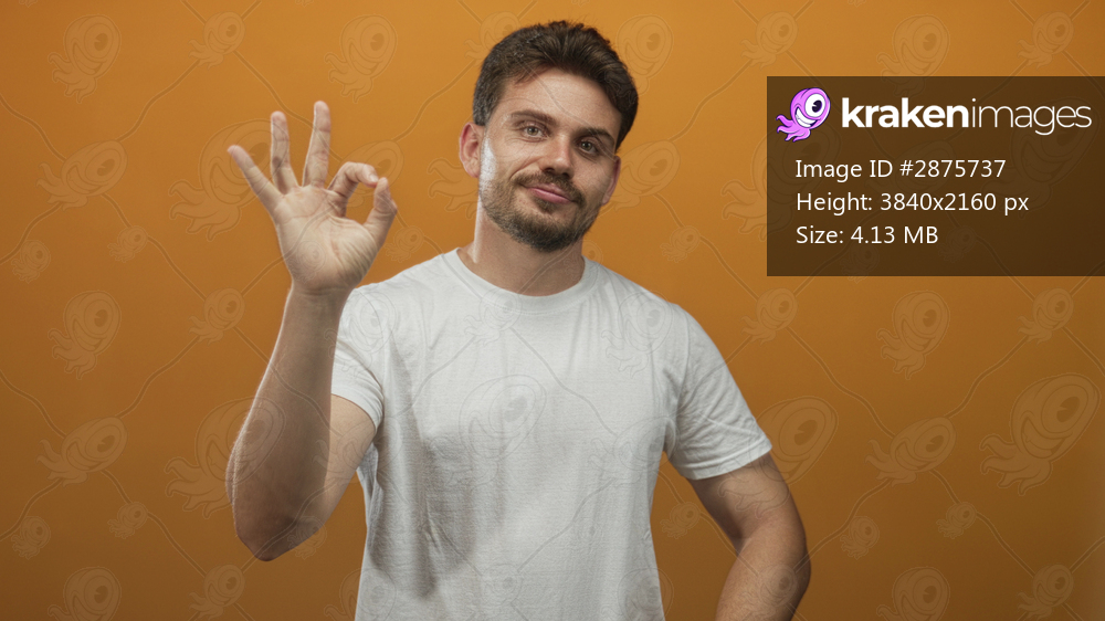 Young hispanic man making ok hand sign with palm facing camera and relaxed smile while wearing white t shirt in orange studio setting; approval agreement gesture. - Kraken Images