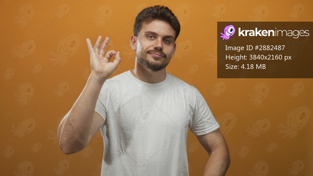 Young hispanic man making ok hand sign with palm facing camera and relaxed smile while wearing white t shirt in orange studio setting; approval agreement gesture. - Kraken Images