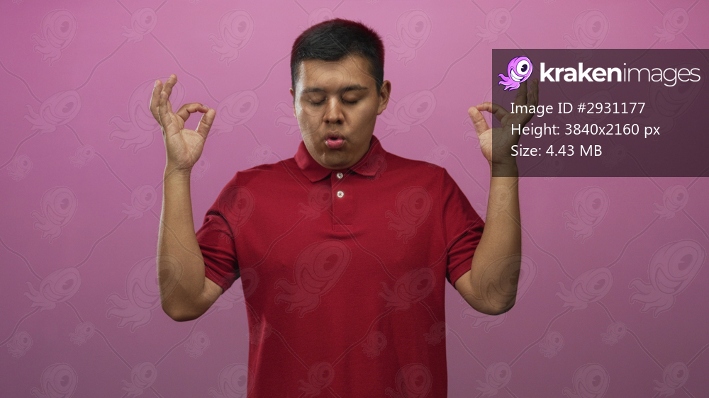 Young hispanic man making ok sign with both hands and pursed lips in pink studio wearing red polo shirt; calm mindfulness.