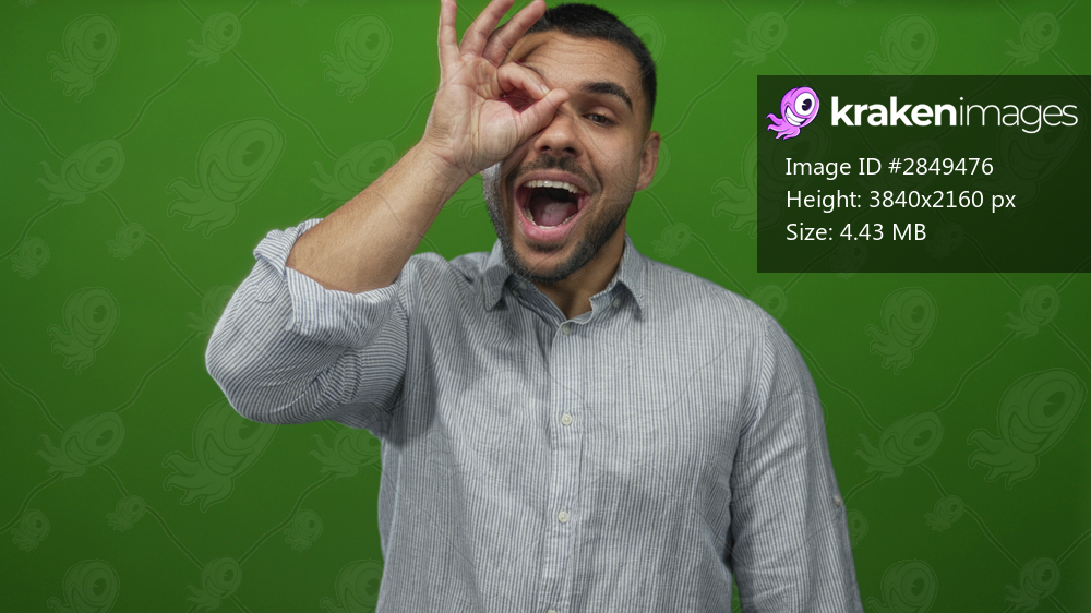 Young hispanic man making ok sign with hand over eye in studio with green screen wall under bright lighting; approval optimism positivity confidence.