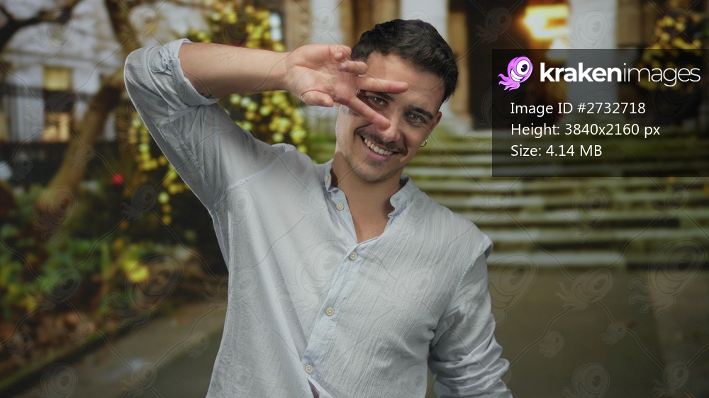 Young hispanic man making peace sign gesture outdoors on a city street with festive christmas lights in the background.