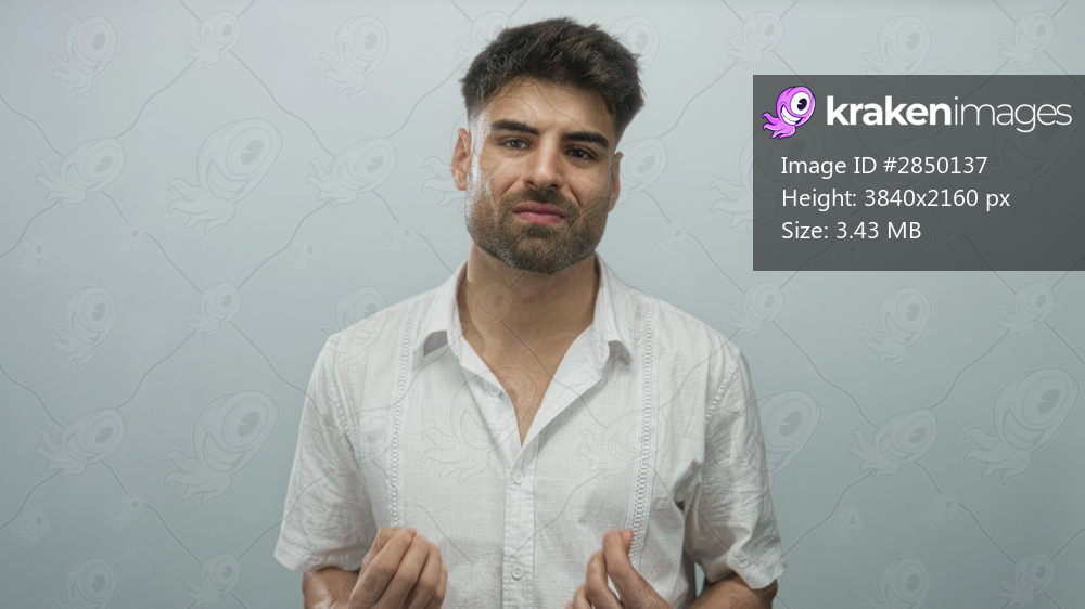 Young hispanic man making pinched fingers gesture in studio setting against light blue backdrop; thoughtfulness.