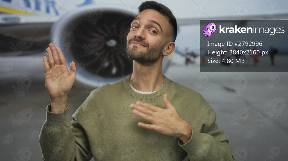Young hispanic man making pledge gesture at airport terminal with airplane in the background, capturing a candid, travel-themed moment suggesting sincerity and travel excitement. - Kraken Images