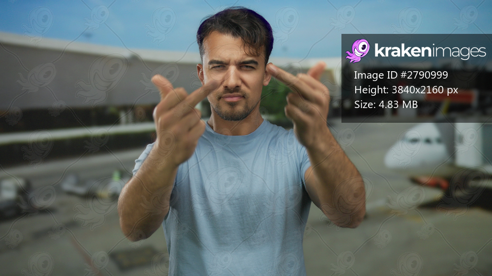 Young hispanic man making rude gestures at an airport with blurred airplanes in the background, conveying frustration and defiance in a casual travel setting outdoors. - Kraken Images