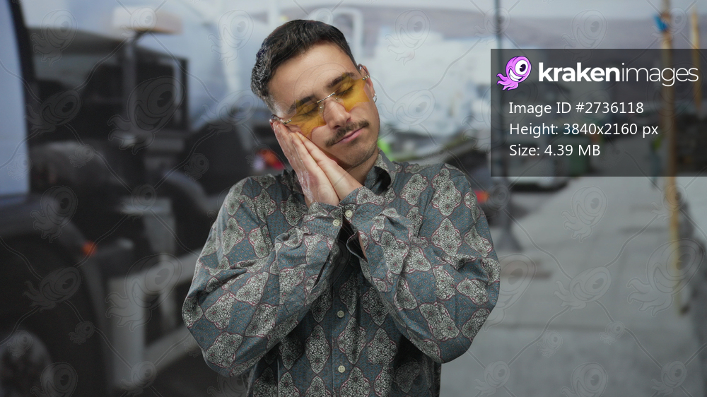 Young hispanic man making sleep gesture on city street wears sunglasses and patterned shirt in sunny urban environment with parked cars and industrial background. - Kraken Images