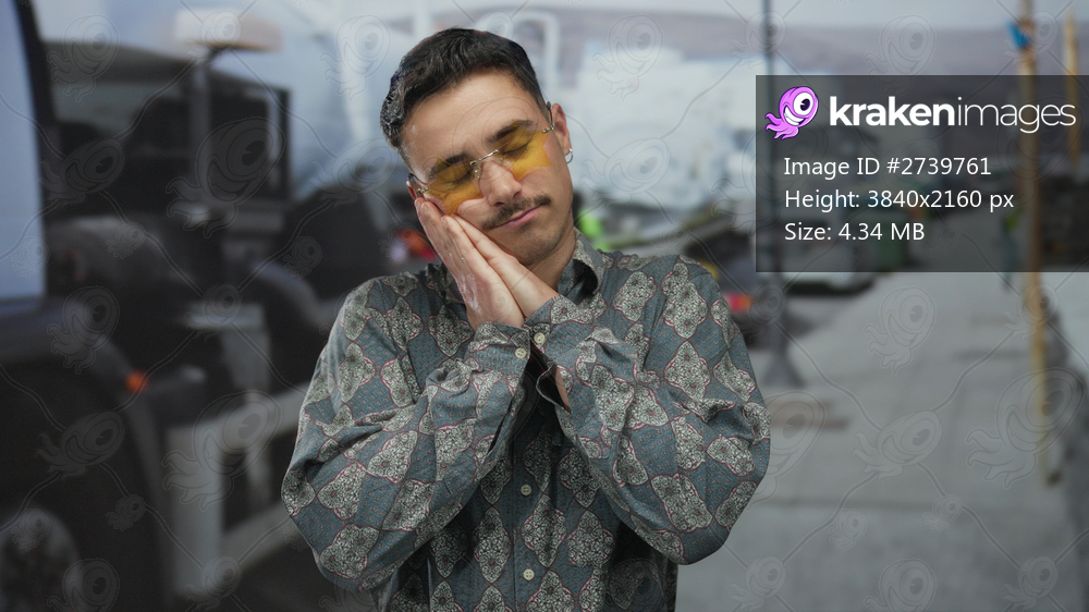 Young hispanic man making sleep gesture on city street wears sunglasses and patterned shirt in sunny urban environment with parked cars and industrial background. - Kraken Images