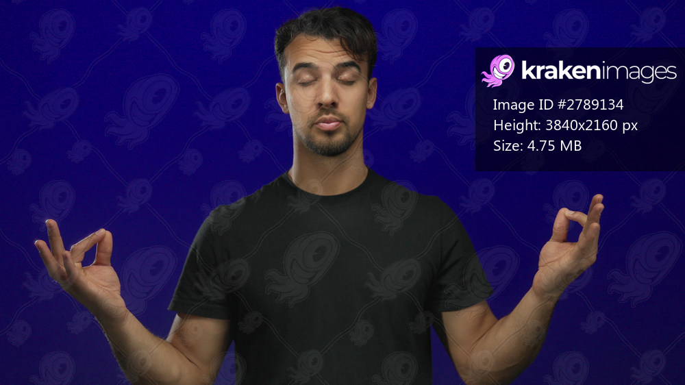 Young hispanic man meditates with closed eyes and hands in mudra pose against an isolated blue background conveying calm and focus.