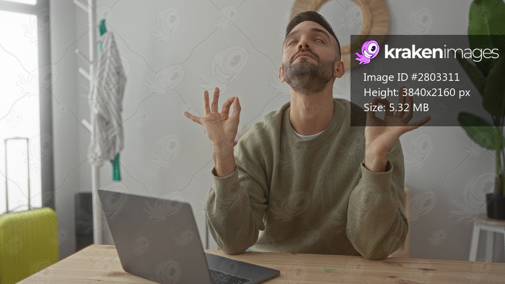 Young hispanic man meditating on laptop in cozy indoor living room with a serene expression, creating a relaxed home office ambiance emphasizing work-life balance. - Kraken Images