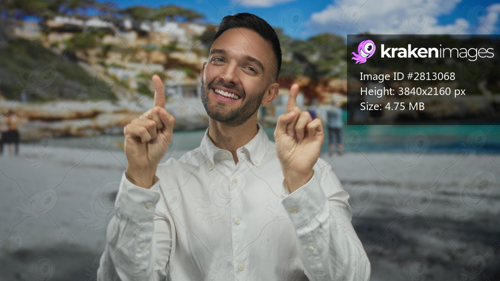 Young hispanic man on a beach making hand gestures with a joyful expression against a scenic seashore background on a sunny day outdoors.