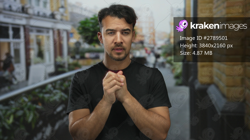 Young hispanic man on a city street looks pensive with hands clasped in a bustling outdoor urban environment suggesting deep thought or nervous anticipation. - Kraken Images