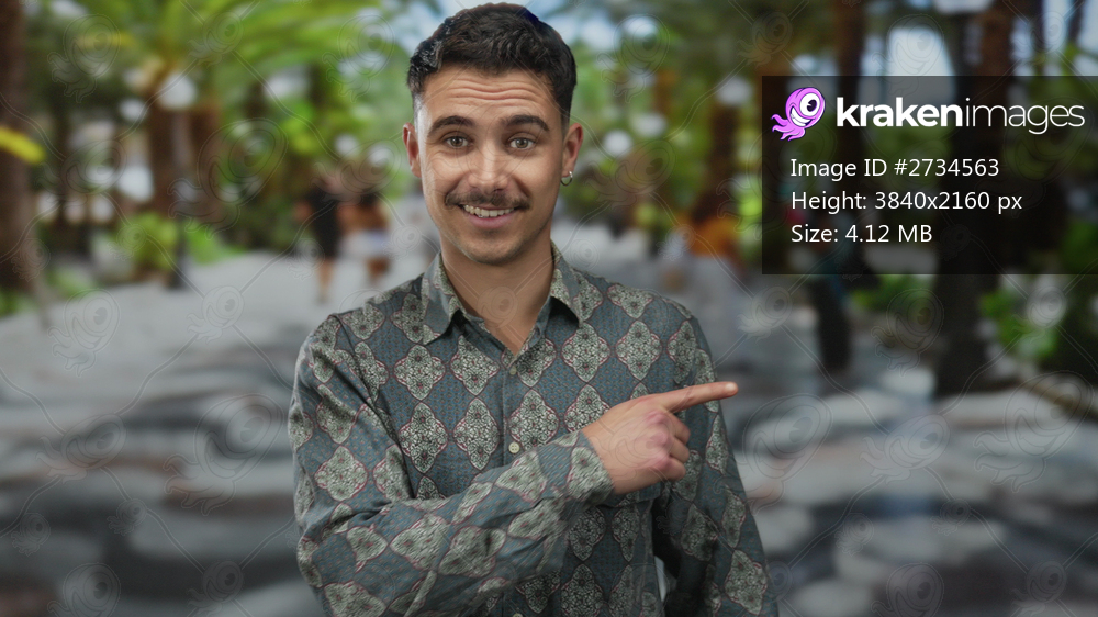 Young hispanic man on city street giving thumbs up, surrounded by blurry pedestrians and palm trees in an urban outdoor setting, wearing patterned shirt with a confident expression. - Kraken Images