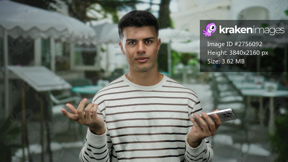 Young hispanic man on terrace holding phone looks contemplative outside a city cafe wearing striped shirt surrounded by tables and chairs in an urban outdoor setting - Kraken Images