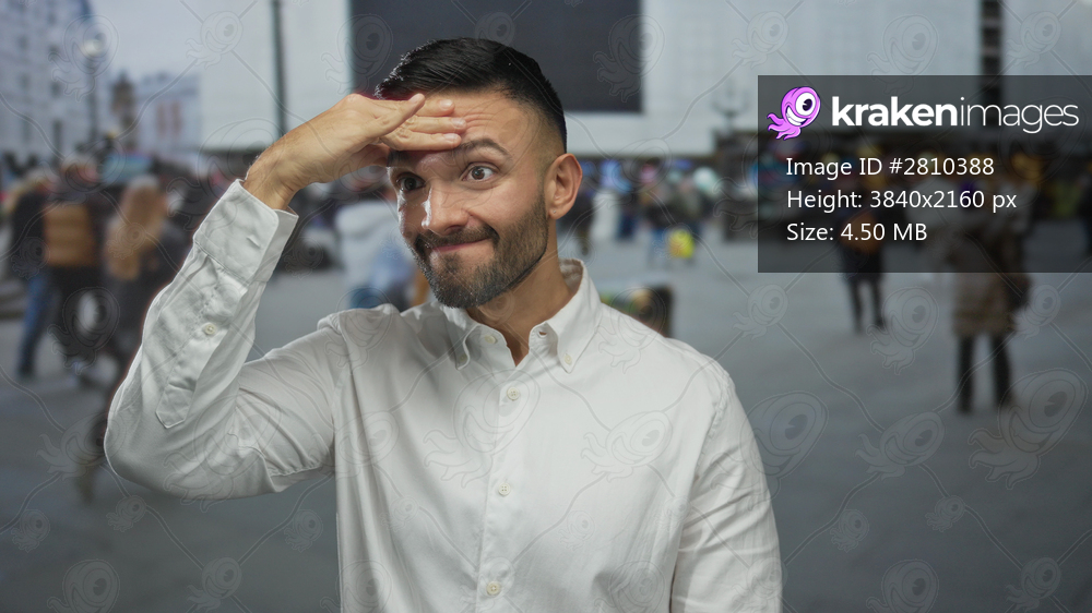 Young hispanic man on urban street outdoors looking thoughtful with hand on forehead as diverse city crowd blurs by in background.