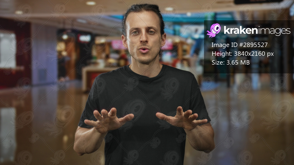 Young hispanic man with open palms and raised hands in a building shopping mall center, long hair and earrings visible; seeking connection concentration. - Kraken Images