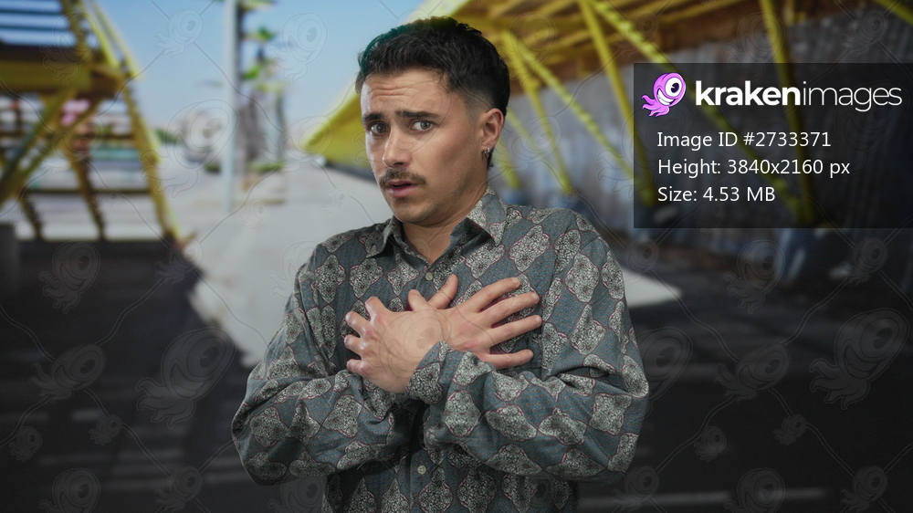 Young hispanic man outdoors city street looking scared with hands on chest under bright sunlight and modern urban background.